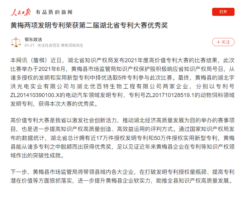 宇洪光電發明專利榮獲湖北省2021年度高價值專利大賽優秀獎!