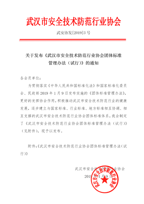 關于發布《武漢市安全技術防范行業協會團體標準管理辦法(試行)》的通知