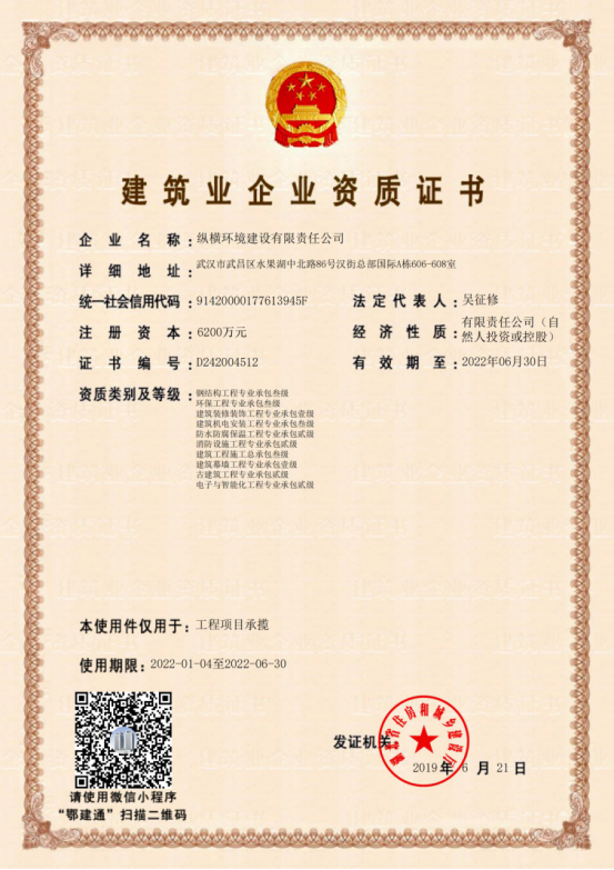 承包業(yè)績相適應(yīng)國外工程項(xiàng)目,電子與智能化工程專業(yè)承包貳級、建筑裝修裝飾工程專業(yè)承包壹級、建筑裝修裝飾工程設(shè)計(jì)專項(xiàng)甲級、建筑機(jī)電安裝工程專業(yè)承包叁級、建筑幕墻工程專業(yè)承包壹級、消防設(shè)施工程專業(yè)承包貳級、古建筑工程專業(yè)承包貳級、建筑工程施工總承包叁級、鋼結(jié)構(gòu)工程專業(yè)承包叁級、環(huán)保工程專業(yè)承包叁級等專項(xiàng)資質(zhì)。