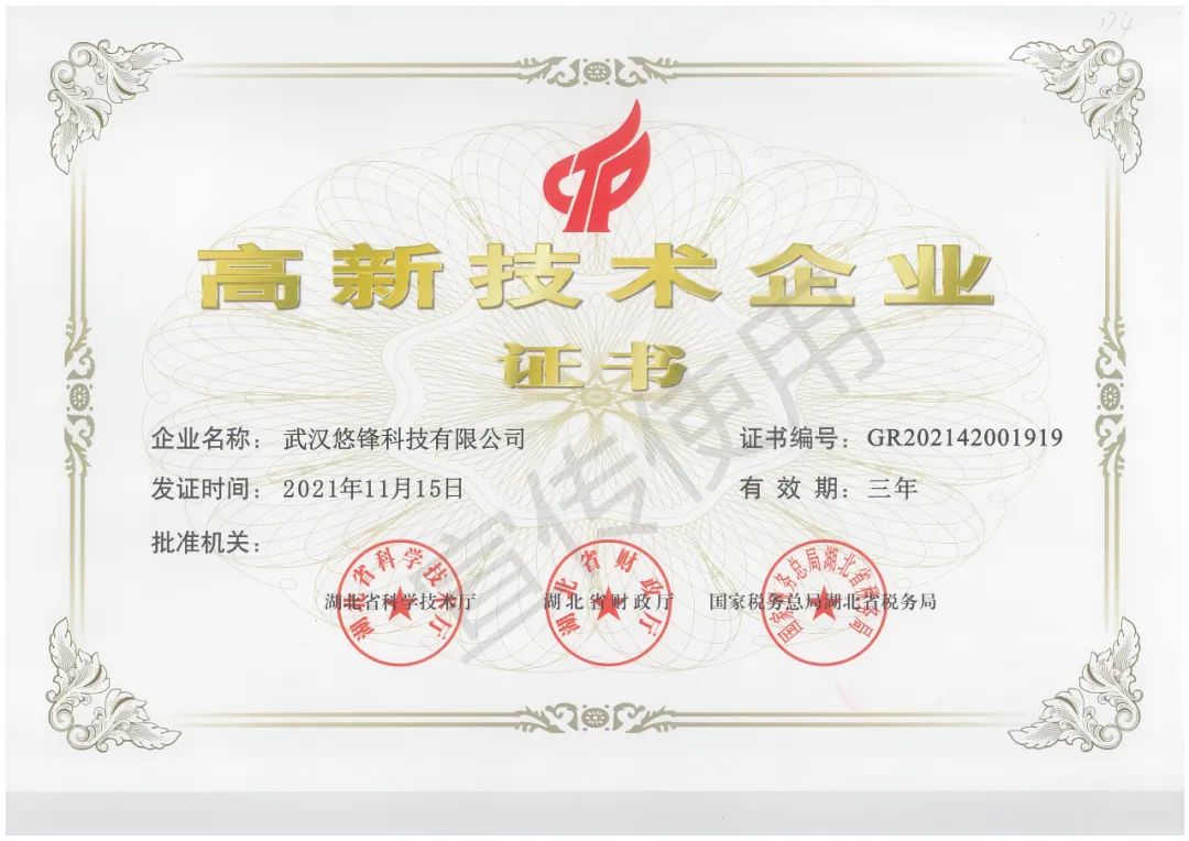 ? ? ? ? 2021年根據國家《高新技術企業認定管理辦法》和《高新技術企業認定管理工作指引》的相關規定,經國家備案批復,武漢悠鋒科技有限公司被認定為”國家高新技術企業”,2022年由湖北省科學技術廳、湖北省財政廳、國家稅務總局湖北省稅務局聯頒發了《高新技術企業證書》。
