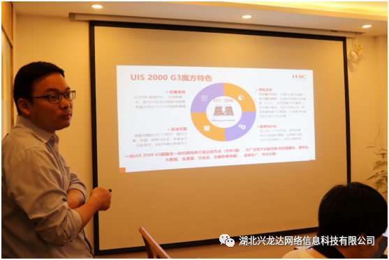 新華三湖北代表處云智產品線專家—陳歷淼(下圖左一)講解了新華三的超融合及云桌面解決方案和相關案例。
