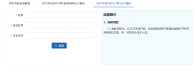 根據取得職稱的時間,在頁面下輸入對應的姓名、身份證號及專業即可查詢到職稱電子證書信息。