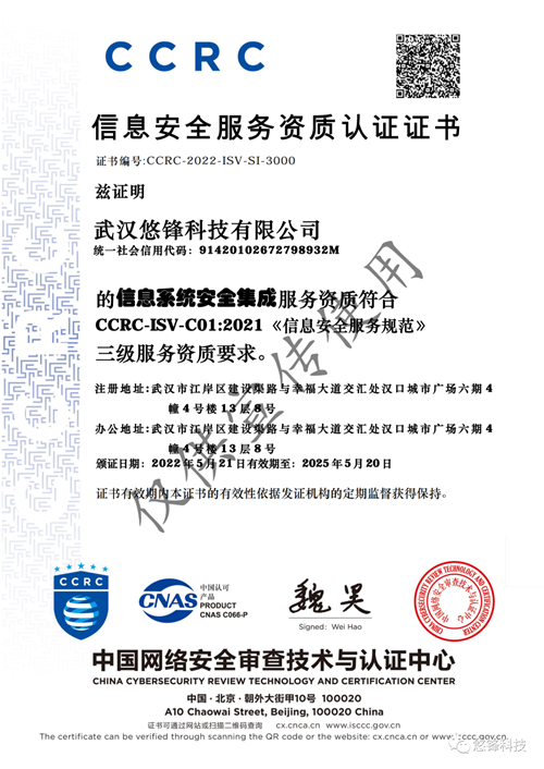 ? ? ? ? 2022年根據(jù)中國網(wǎng)絡(luò)安全審查技術(shù)與認(rèn)證中心的相關(guān)規(guī)定,經(jīng)國家備案批復(fù),武漢悠鋒科技有限公司于5月21日取得《CCRC信息安全服務(wù)資質(zhì)認(rèn)證證書》。