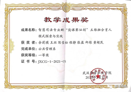 武漢警官職業學院黨委書記、校長陳風華為悠鋒科技總經理黃超民頒發教學成果獎。悠鋒科技黃超民參與智慧司法群“崗課賽證創”五育人模式探索與實踐團隊,榮獲教學成果一等獎。黃超民獲獎后表示,感謝有機會參與武漢警官職業學院教學成果比賽,悠鋒科技作為武漢警官職業學院實習就業基地,近年來學院每年都有畢業生到悠鋒科技實習、就業。感謝學院為企業提供人才,同時對學院畢業生的綜合能力表示肯定。