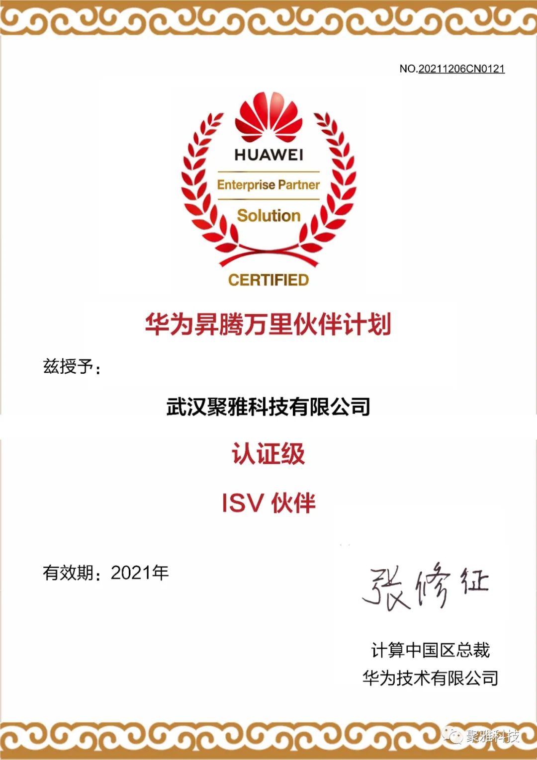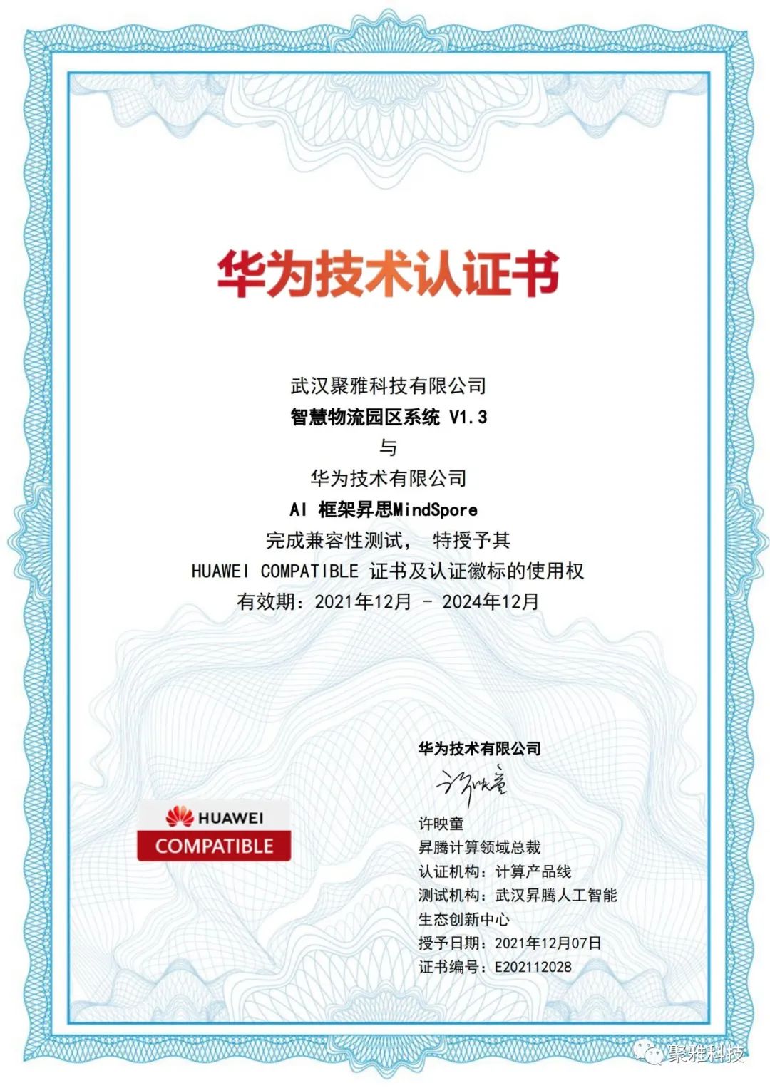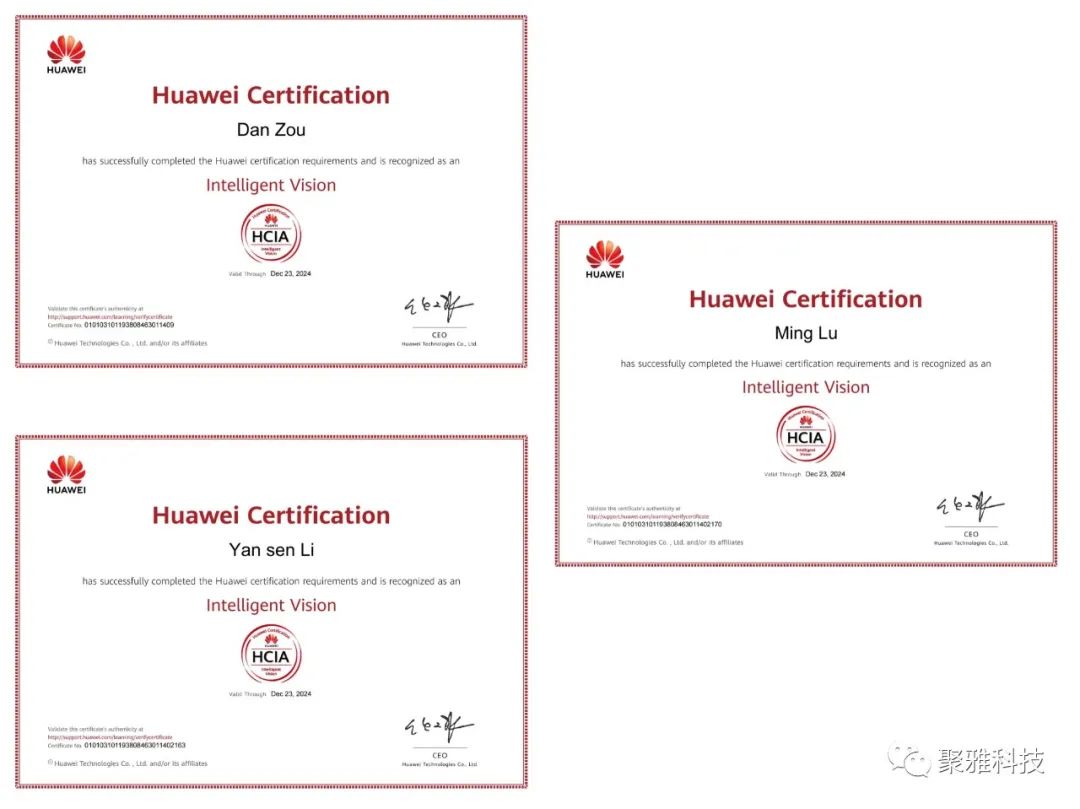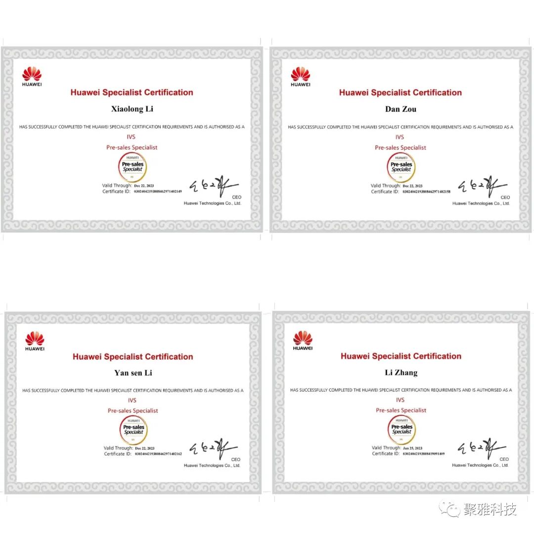 ? ? ? ? 武漢聚雅科技有限公司是華為技術有限公司的智能安防分銷金牌經銷商、武漢聚雅科技有限公司智慧物流園區系統V1.3與華為技術有限公司HUAWEI COMPATIBLE證書、聚雅科技華為昇騰萬里伙伴計劃認證級IVS伙伴;企業員工經過華為的層層培訓與考核,擁有證書有:華為IVS售前L2證書4名、華為HCIA證書3名。