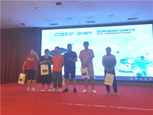 會(huì)議最后的答謝觀眾抽獎(jiǎng)環(huán)節(jié),由CPSE安博會(huì)提供的保溫杯、宇航光通提供的交換機(jī)、吉影科技提供的GT-1筋膜槍、東芝提供的工具包等獎(jiǎng)品回饋現(xiàn)場觀眾,武漢市安全技術(shù)防范行業(yè)協(xié)會(huì)秘書長陳虎、東芝電子元件(上海)有限公司存儲(chǔ)產(chǎn)品銷售經(jīng)理傅琪瀚為獲獎(jiǎng)的幸運(yùn)嘉賓頒獎(jiǎng)并合影留念。