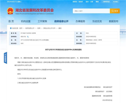 ? ? ? ? 9月5日,湖北省發(fā)改委公布了2022年湖北省企業(yè)技術中心名單的通知,鳴飛偉業(yè)技術有限公司榮獲“湖北省企業(yè)技術中心”稱號。?