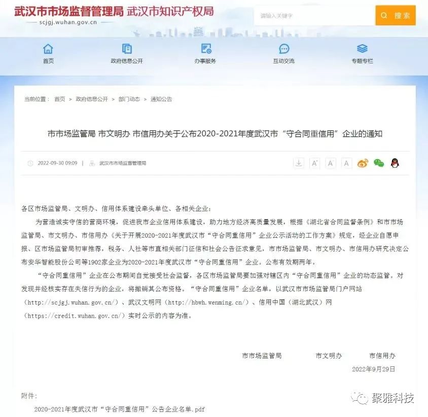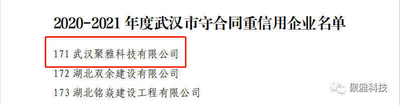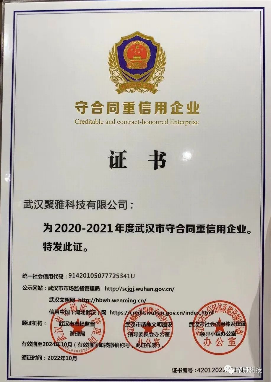 近日,武漢市市場監(jiān)督管理局市文明辦市信用辦發(fā)文公布武漢市2020-2021年度“守合同重信用”企業(yè)名單。武漢聚雅科技有限公司憑借質(zhì)量管理制度健全、信用管理體系健全、合同簽約行為規(guī)范、合同履約狀況良好、社會(huì)信譽(yù)好等能力,被授予武漢市“守合同重信用”企業(yè)榮譽(yù)稱號(hào)。