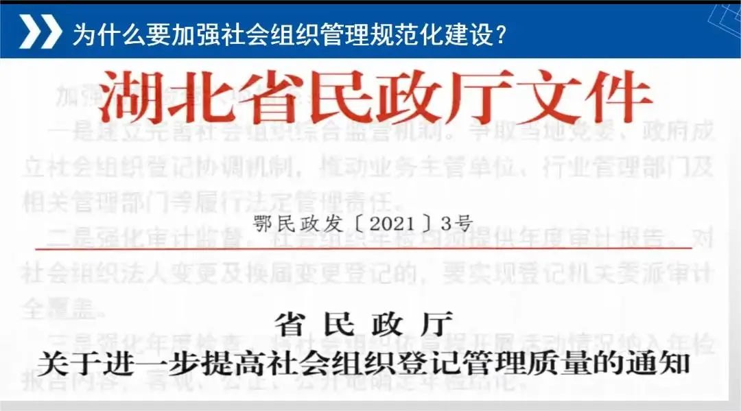 課堂上,老師講解了[2021]3號湖北省民政廳文件,《省民政廳 關(guān)于進(jìn)一步提高社會組織登記管理質(zhì)量的通知》,建立完善社會組織綜合管理機(jī)制;強(qiáng)化審計(jì)監(jiān)督;強(qiáng)化年度檢查;強(qiáng)化現(xiàn)場檢查;推進(jìn)監(jiān)管“關(guān)口”前移;完善社會組織重大活動報(bào)告制度。