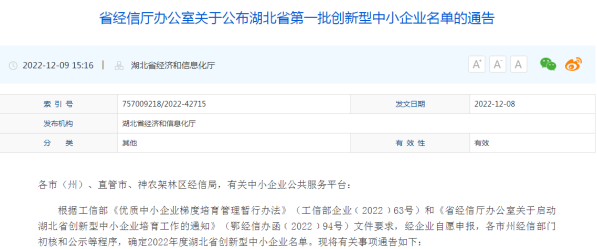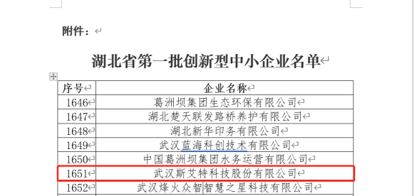 根據工信部《優質中小企業梯度培育管理暫行辦法》和《省經信廳辦公室關于啟動湖北省創新型中小企業培育工作的通知》文件要求,經武漢市經信局復審通過,武漢斯艾特科技股份有限公司順利入選2022湖北省創新型中小企業。