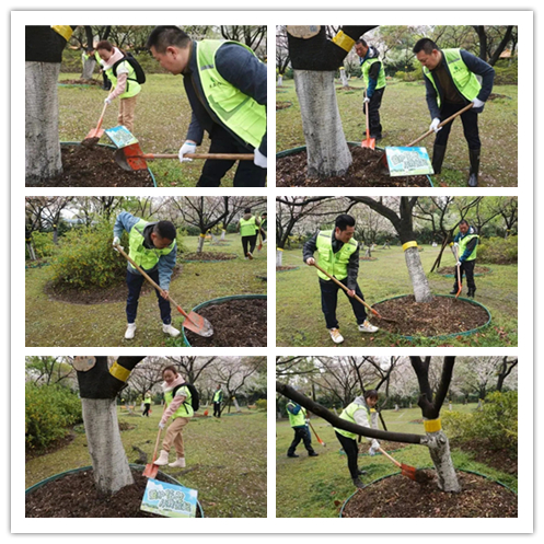 ? ? ? ? 一大早,大家頂著寒風細雨,拿著鐵鍬,給梅花翻土。大家通力協作、配合默契,三四人組成一組,揮鍬鏟土、培實土壤,之后給認養的梅花掛上認養牌,為春日里的青山公園增添了“新綠”。