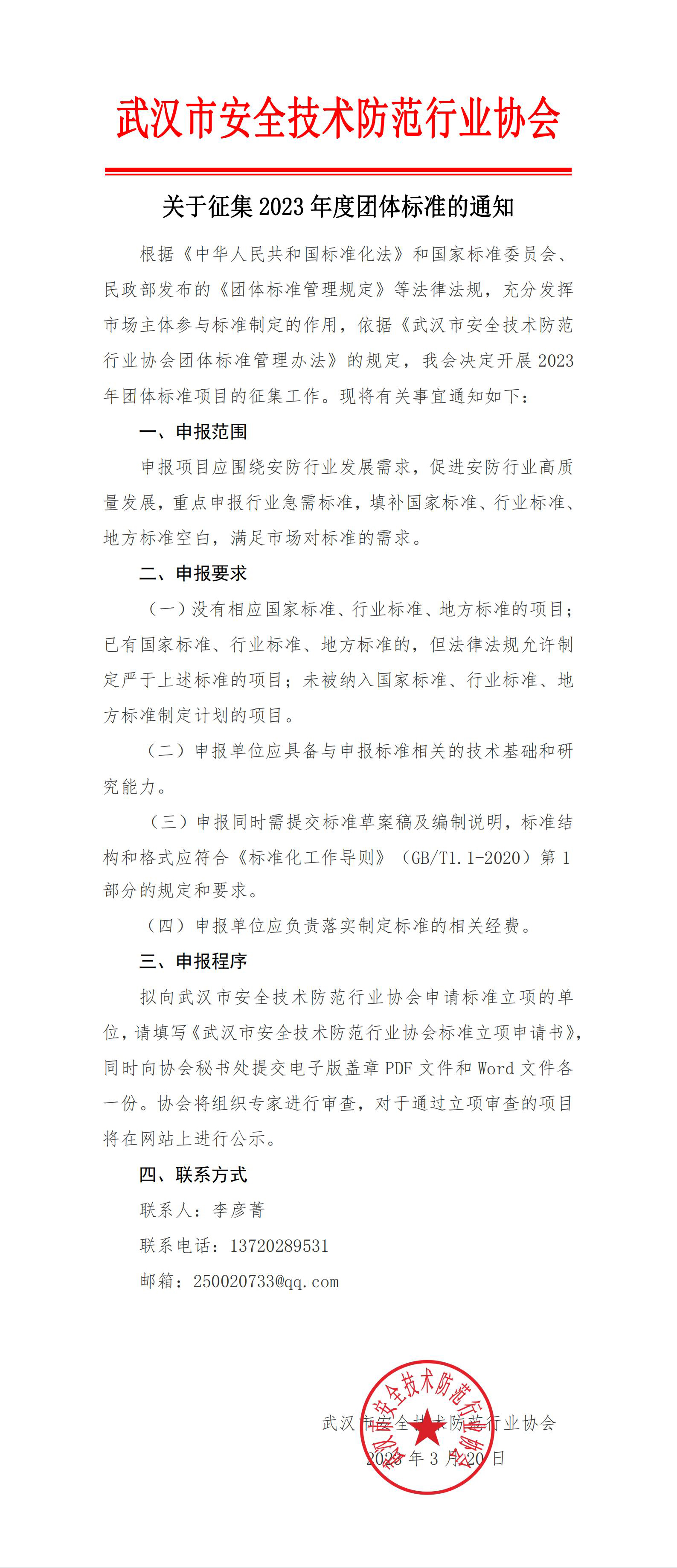 根據《中華人民共和國標準化法》和國家標準委員會、民政部發布的《團體標準管理規定》等法律法規,充分發揮市場主體參與標準制定的作用,依據《武漢市安全技術防范行業協會團體標準管理辦法》的規定,我會決定開展2023年團體標準項目的征集工作。現將有關事宜通知如下: