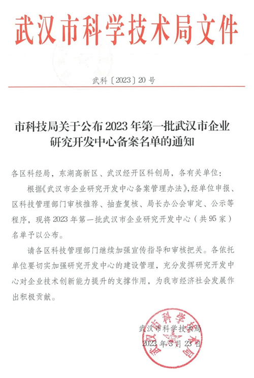 ? ? ? ? 根據《武漢市企業研究開發中心備案管理辦法》,經單位申報、區科技管理部門審核推薦、抽查復核、局長辦公會審定、公示等程序,3月23日,武漢市科技局公布了2023年第一批武漢市企業研究開發中心備案名單,全市95家單位獲批,景網公司研究開發中心榮幸在列。