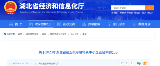 ? ? ? 根據省經信廳辦公室《關于開展第五批專精特新中小企業培育工作的通知》文件要求,2023年湖北省第五批專精特新中小企業名單已公示,全省此次入選企業共1803家,我司順利入選。