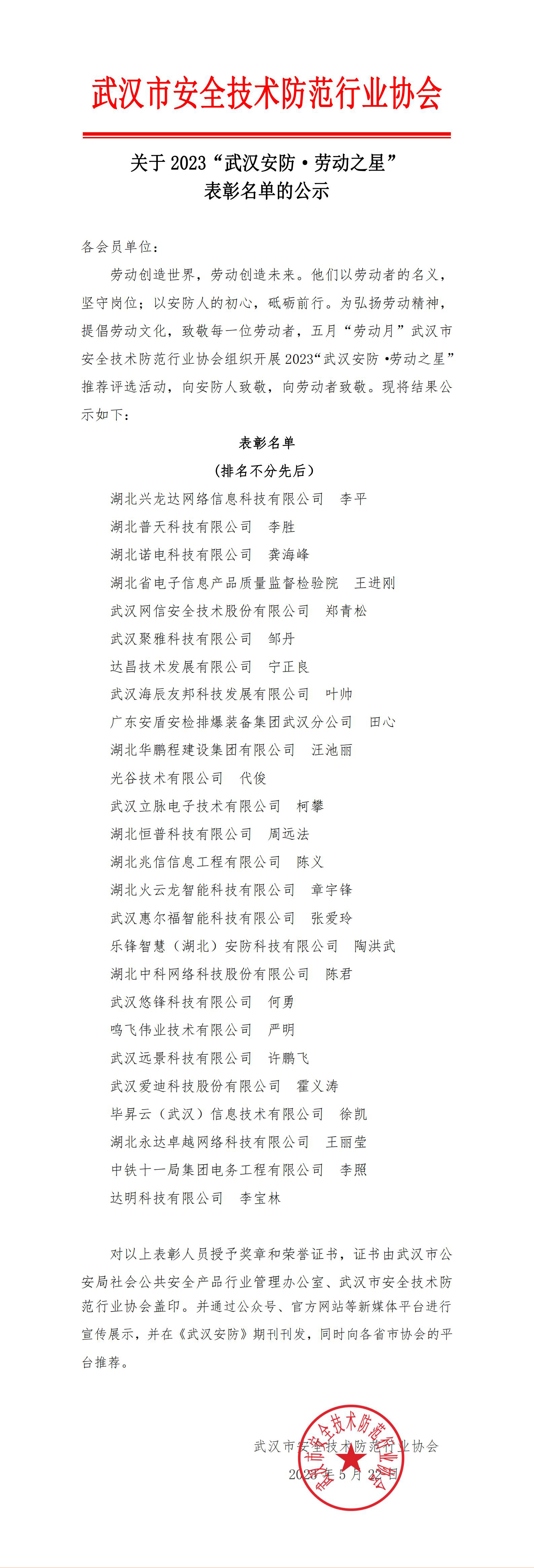 關(guān)于2023“武漢安防·勞動(dòng)之星”表彰名單的公示