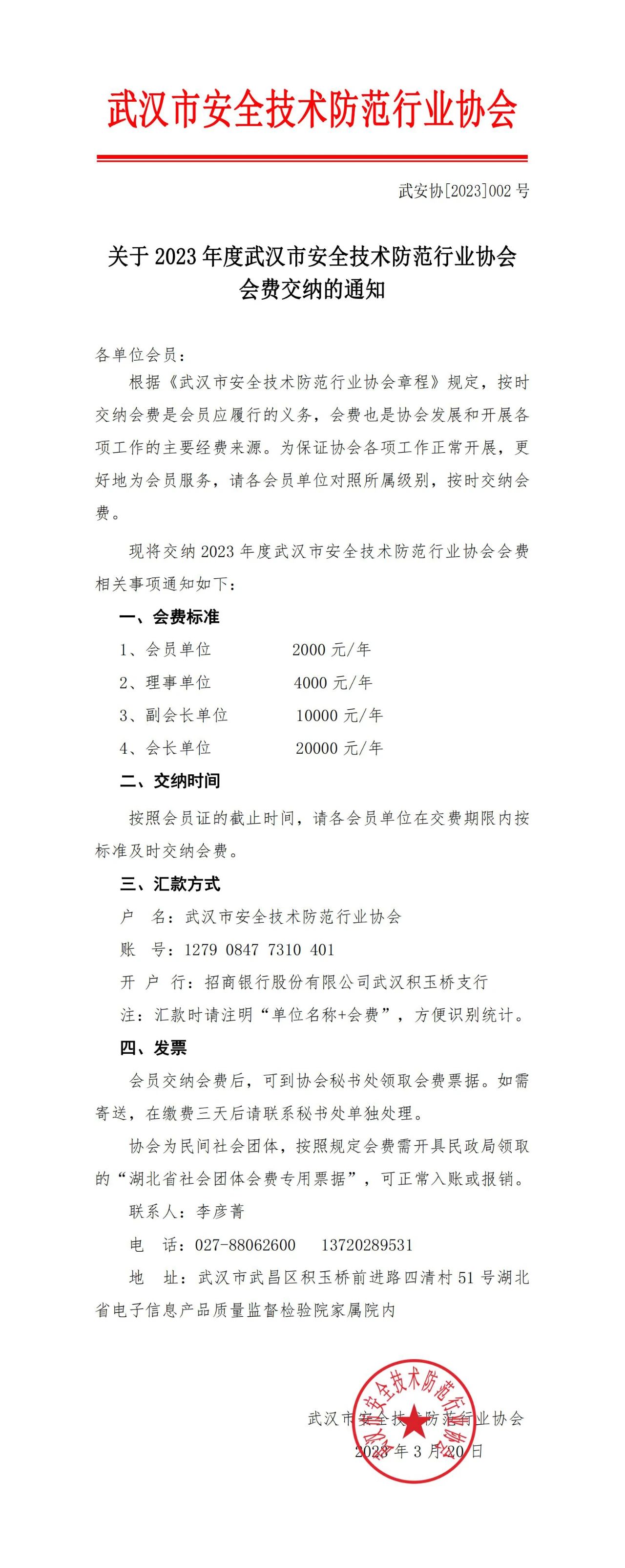 2023年度武漢市安全技術防范行業協會會費交納通知