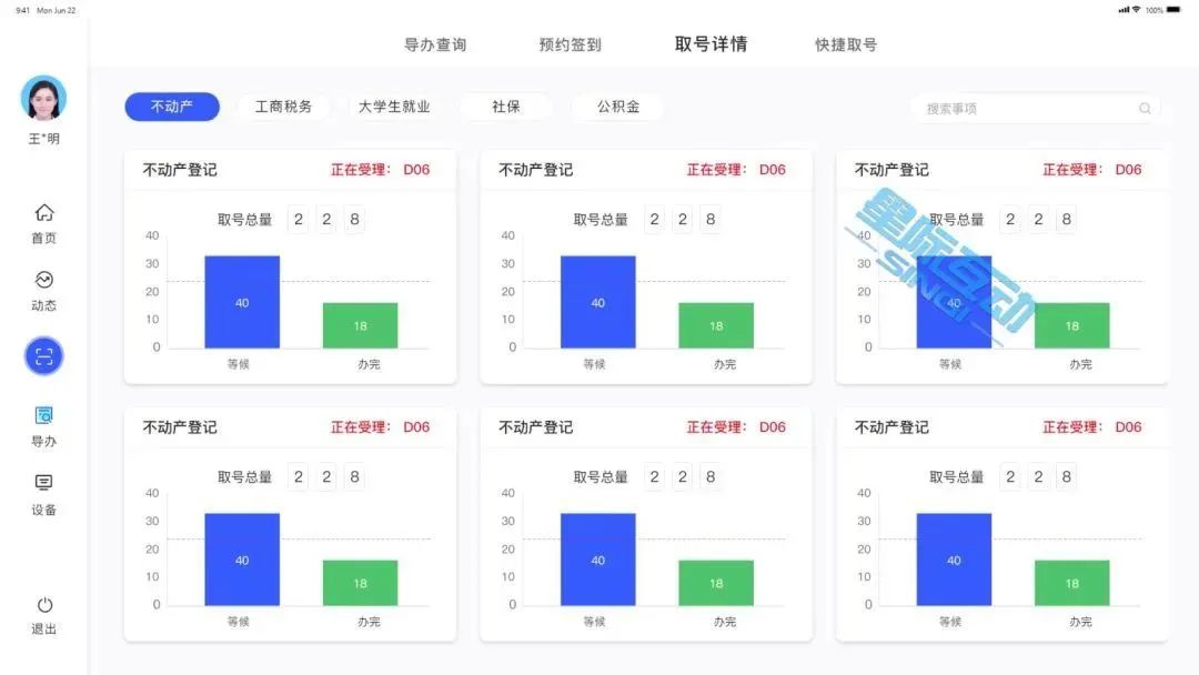 支持以液態圖形化方式展示導辦人員所管轄區域內各窗口相關取號實時數據,包括但不限于正在受理號票、等候人員、辦理完畢、累計取號、平均取號等數據;