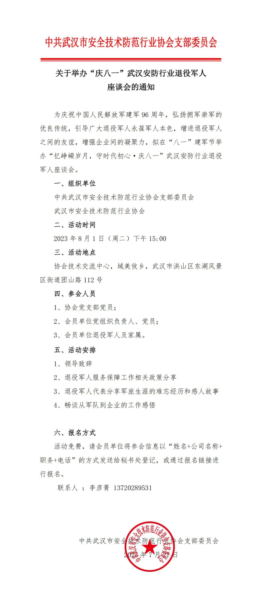 關(guān)于舉辦“慶八一”武漢安防行業(yè)退役軍人座談會的通知