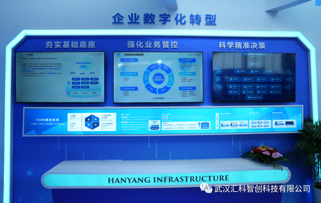 漢陽市政匯科智創(chuàng)展臺融合了70周年以及信息技術(shù)等元素,展現(xiàn)公司在數(shù)字化軟件研發(fā)、智能集成、數(shù)字孿生等領(lǐng)域的實力。在企業(yè)數(shù)字化轉(zhuǎn)型板塊,講述公司圍繞工程建設(shè)行業(yè)企業(yè)數(shù)字化轉(zhuǎn)型需求,賦能傳統(tǒng)建筑企業(yè)的成果。以企業(yè)內(nèi)部高效協(xié)同辦公、工程項目全周期智慧化管控為目標,打造企業(yè)IT品牌矩陣,提升科學(xué)戰(zhàn)略規(guī)劃、智慧項目管理、綜合數(shù)據(jù)運營等核心數(shù)字化能力,通過數(shù)字化轉(zhuǎn)型實現(xiàn)彎道超車、產(chǎn)業(yè)轉(zhuǎn)型升級,提高企業(yè)核心競爭力。
