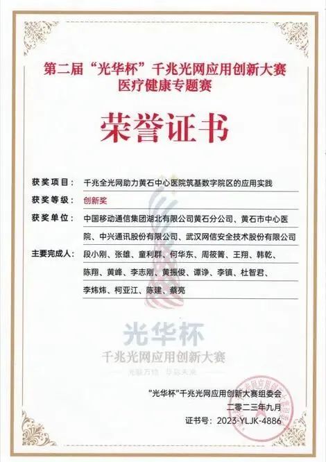 近日,第二屆“光華杯”千兆光網應用創新大賽醫療健康專題賽圓滿落幕,武漢網信安全技術股份有限公司參賽案例“千兆全光網助力黃石中心醫院筑基數字院區的應用實踐”獲得大賽創新獎。