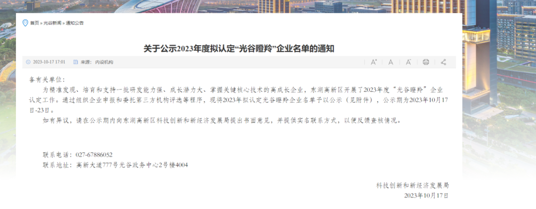 10月17日下午,東湖高新區2023年度擬認定的“光谷瞪羚”企業名單予以公示。