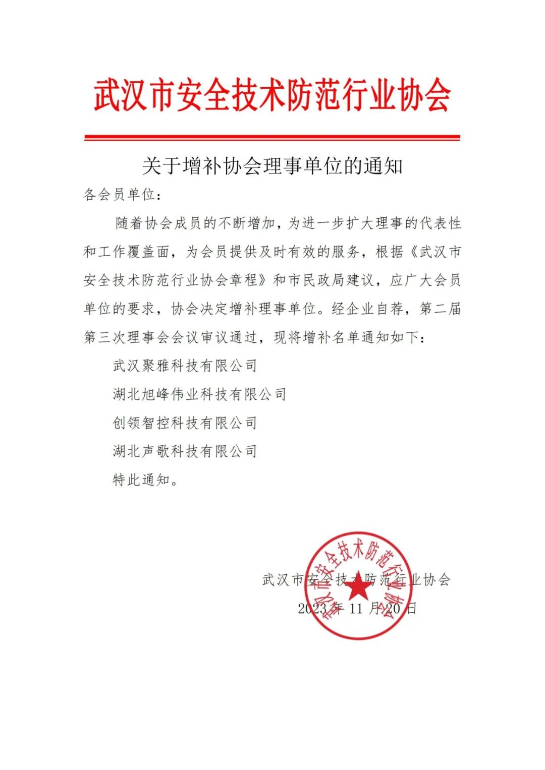 ? ? ? ? 隨著協(xié)會成員的不斷增加,為進一步擴大理事的代表性和工作覆蓋面,為會員提供及時有效的服務(wù),根據(jù)《武漢市安全技術(shù)防范行業(yè)協(xié)會章程》和市民政局建議,應(yīng)廣大會員單位的要求,協(xié)會決定增補理事單位。經(jīng)企業(yè)自薦,第二屆第三次理事會會議審議通過,現(xiàn)將增補名單通知如下: