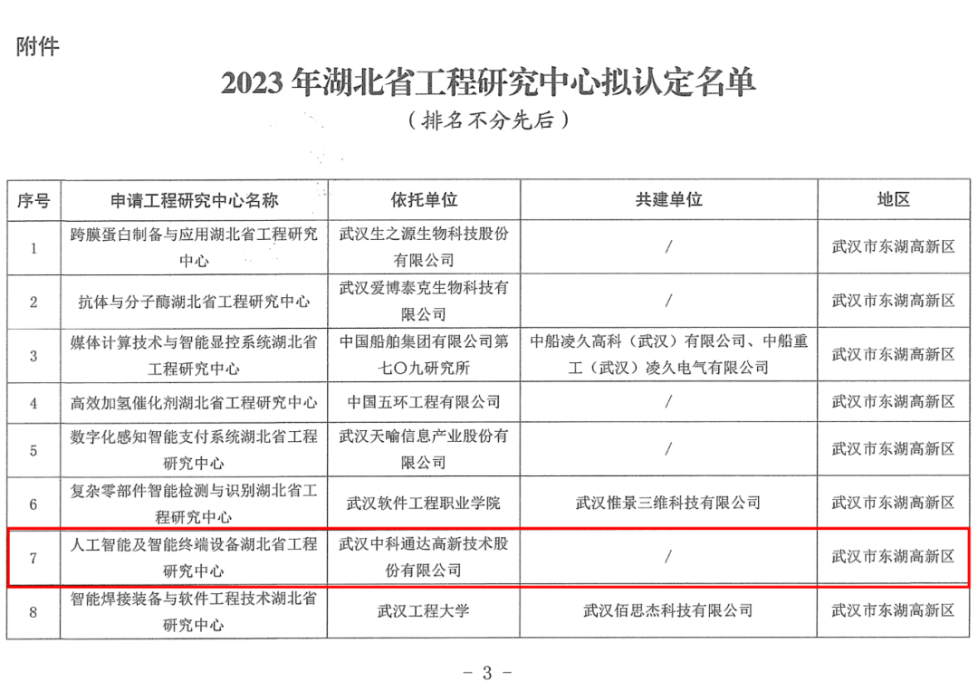 2023年11月22日,湖北省發展和改革委員會公示“2023年湖北省工程研究中心認定名單”。此名單系根據《湖北省工程研究中心管理辦法》,經企業申報、資格審查、專家評審、信用審查等環節,本次共認定53家湖北省工程研究中心。中科通達“人工智能及智能終端設備湖北省工程研究中心”獲得認定。