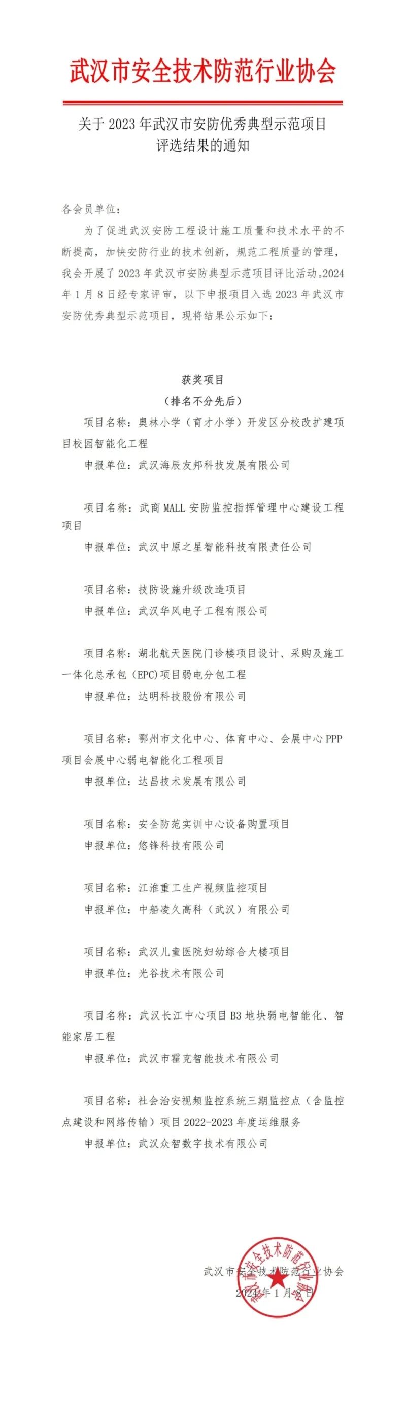 2024年1月8日經專家評審會評審,以下10個項目入選2023年武漢市優秀安防典型示范項目,現將結果公示如下: