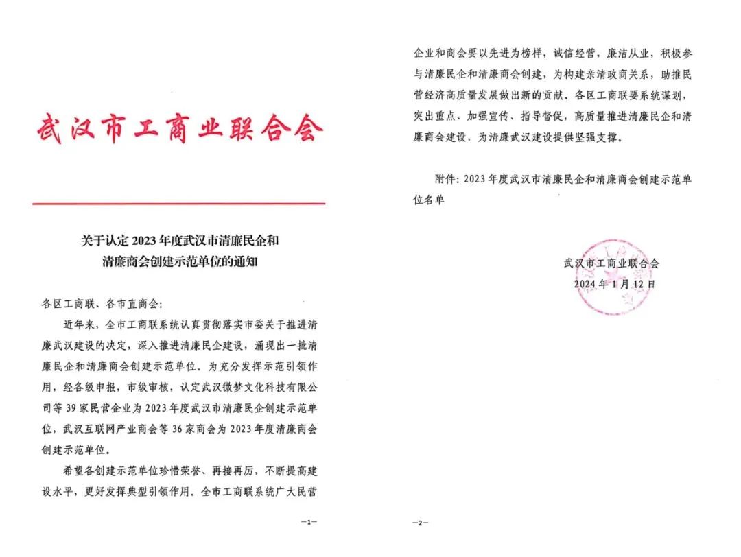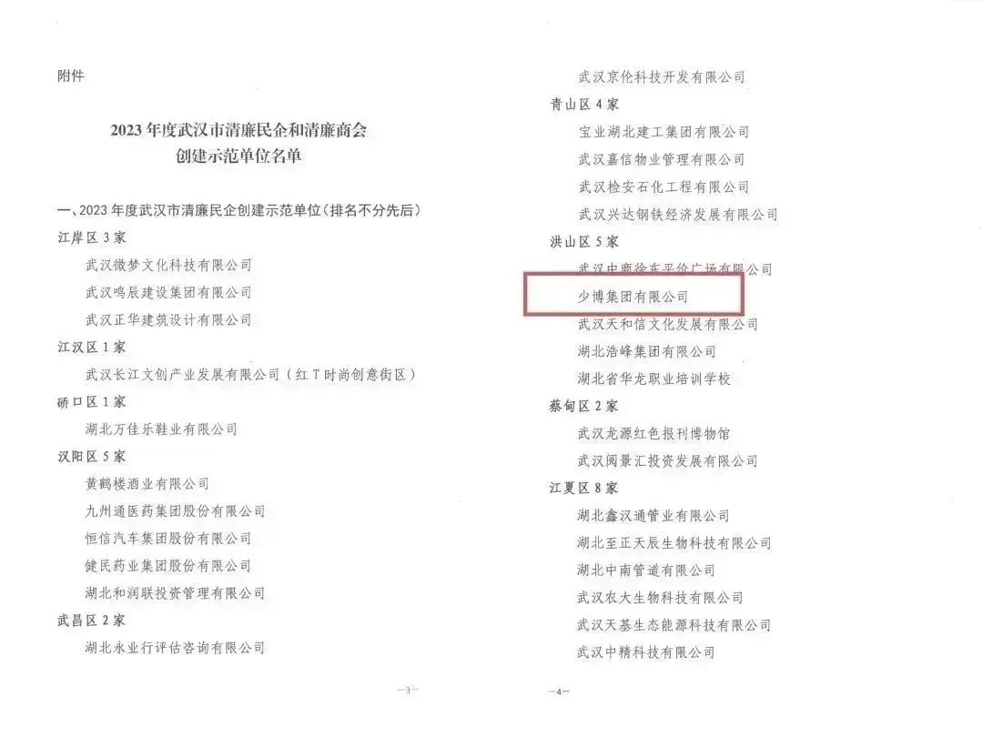 近日,根據武漢市工商聯“關于認定2023年度武漢市清廉民企和清廉商會創建示范單位的通知”,少博集團有限公司獲評“2023年度武漢市清廉民企創建示范單位”。