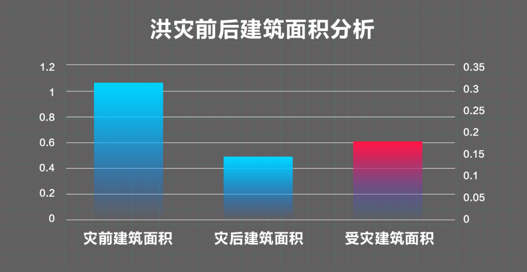 洪災發生前,該區域建筑面積為0.322平方公里。受洪災影響,直接淹沒的地區達到0.179平方公里,超過半數建筑受損,所有建筑均不同程度受到洪災影響。