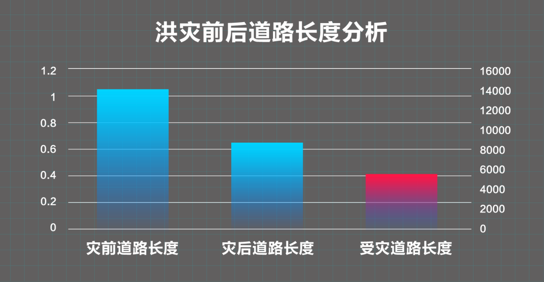 洪災發生前,該道路長度為13790.2米。洪災后,被洪水淹沒的道路長度為5360.54米,所有道路均不同程度受到洪災影響,道路交通基本癱瘓。