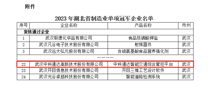 2024年6月12日,湖北省經濟和信息化廳公布“2023年湖北省制造業單項冠軍企業”名單。中科通達獲評“2023年湖北省制造業單項冠軍企業”, “智能交通綜合管控平臺" 獲評單項冠軍產品。