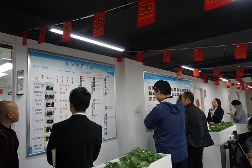 座談后,大家一起參觀斯艾特公司。工作人員統一工服精神抖擻的工作風貌、鮮明的黨建學習園地、員工考核展示、細致全面的規章制度等等,無不給走訪隊伍留下深刻的印象并產生濃厚興趣,進行探討交流。
