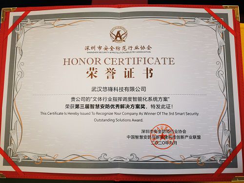 為了表彰先進,遴選優秀解決方案,擴大對安防行業應用解決方案的宣傳推廣,幫助優秀企業樹立品牌形象,同時也為行業用戶選擇產品、方案提供決策依據,深圳市安全防范行業協會自2018起本著客觀、公平、公正的理念進行“智慧安防優秀解決方案”的評選,至今已連續舉辦三屆,共評選出近百個優秀方案,向社會和用戶推薦一批了優秀行業解決方案和相關自主研發產品。武漢悠鋒科技有限公司【文體行業指揮調度智能化系統方案】成功斬獲【2020智慧安防優秀解決方案】大獎。