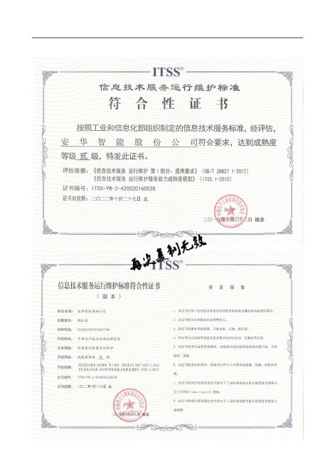 ISO9001質量管理體系認證;ISO14001環境管理體系認證;OHSAS18001職業健康安全管理體系;ISO20000信息技術服務管理體系;ISO27001信息安全管理體系認證證書;ITSS成熟度貳級