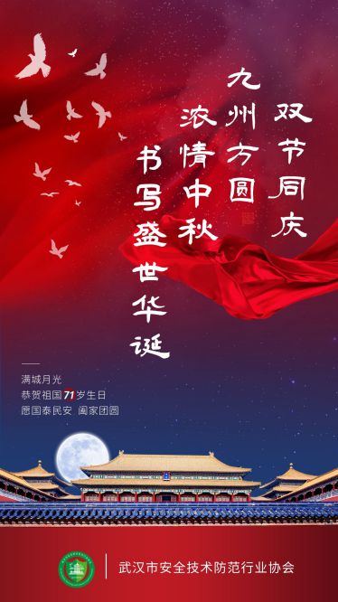 ? ? ? ? 值此中秋國慶佳節之時,武漢市安全技術防范行業協會衷心祝福祖國繁榮昌盛,國泰民安!祝福各位安防同仁中秋國慶雙節快樂,闔家團圓,萬事順心!