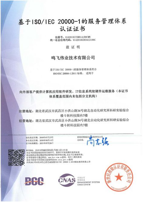 基于ISO/IEC? 20000-1的服務管理體系認證證書