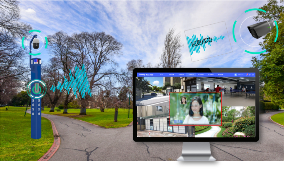 社區空曠區域可部署一鍵報警系統,當有壞人尾隨或者老人突發疾病,可按下報警按鈕,同步畫面會通過報警柱上方球機回傳給報警中心,報警中心能實現對現場的可視化對講。此外在社區部署巡更設備,巡更人員可實現人臉識別打卡,識別成功自定義語音提示,巡更記錄由后端平臺進行查詢。