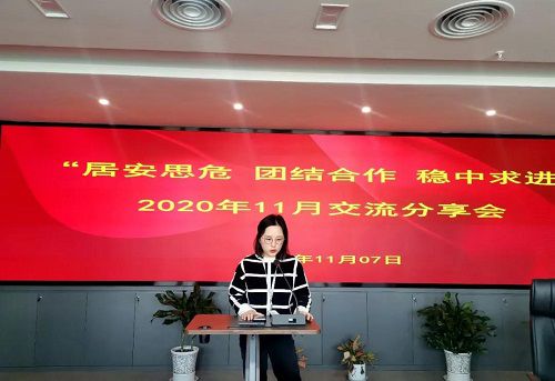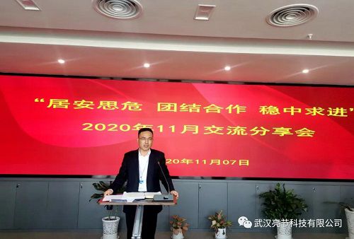 2020年11月7日,會員單位武漢亮節科技有限公司部分在漢員工在公司多功能廳舉行了“居安思危,團結合作,穩中求進”2020年11月交流分享會,董事長歐鵬對十一月工作進行了全面部署,除了日常工作安排外,本月工作重點是項目款項回收、團隊建設、人才儲備及未來項目規劃等四方面,并對各部門的工作有了進一步的要求,大家要統一思想,然后加強實干,立馬行動,而非只是喊口號。