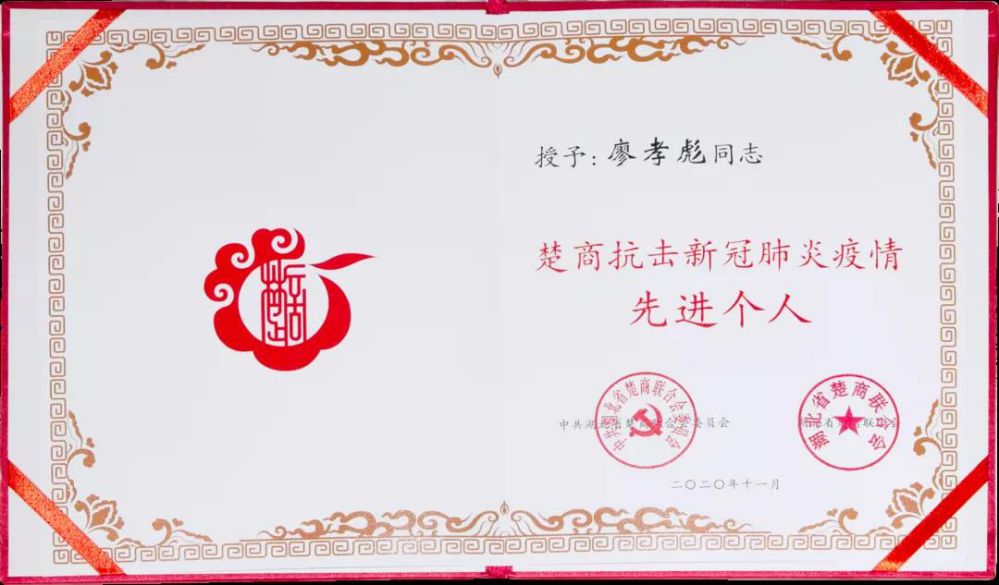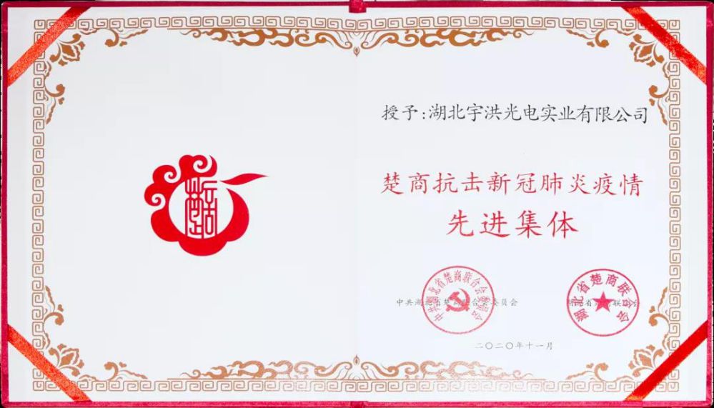 11月10日,湖北省楚商聯(lián)合會(huì)二屆七次會(huì)長(zhǎng)(擴(kuò)大)會(huì)議召開。全球楚商代表齊聚武漢,為第二屆世界大健康博覽會(huì)搖旗吶喊,共話發(fā)展。大會(huì)宣讀了《關(guān)于通報(bào)表揚(yáng)楚商抗擊新冠肺炎疫情先進(jìn)個(gè)人、先進(jìn)集體、優(yōu)秀共產(chǎn)黨員和先進(jìn)基層黨組織的決定》,分別對(duì)抗擊新冠肺炎疫情期間213名先進(jìn)個(gè)人、220家先進(jìn)集體、51名優(yōu)秀共產(chǎn)黨員和48家先進(jìn)基層黨組織進(jìn)行了表彰。其中,宇洪科技全資子公司湖北宇洪,董事長(zhǎng)廖孝彪分別被大會(huì)授予”抗擊新冠肺炎疫情先進(jìn)集體“、“抗擊新冠肺炎疫情先進(jìn)個(gè)人”榮譽(yù)。
