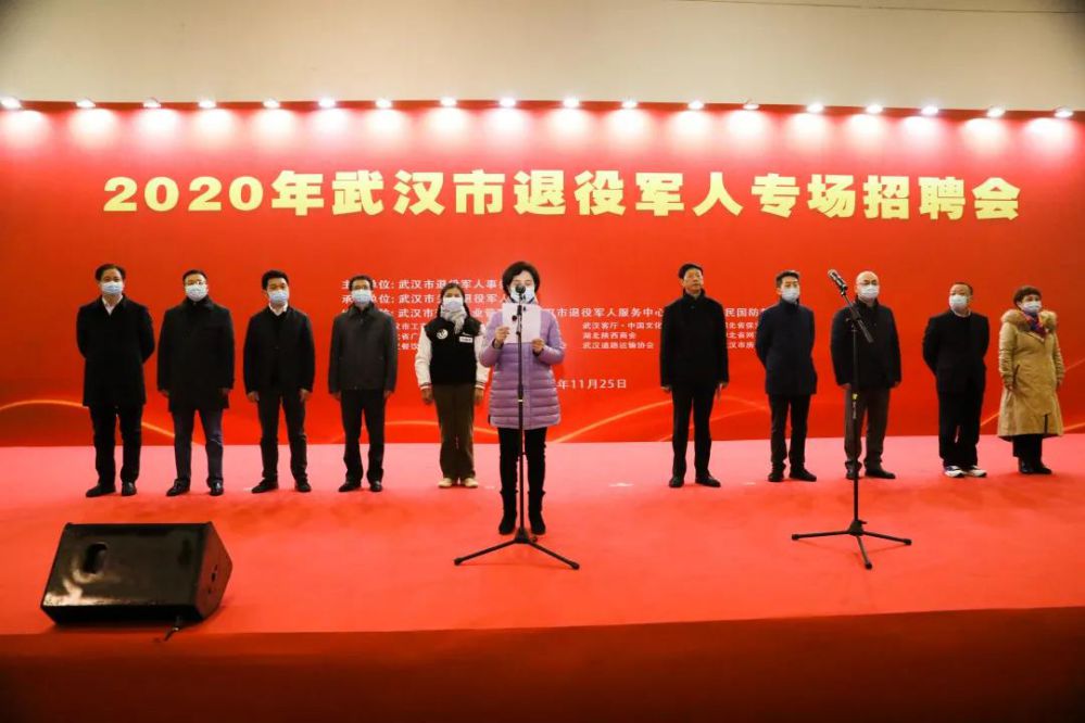 11月25日,2020武漢市退役軍人專場招聘會在武漢客廳文化博覽中心舉辦。招聘會由武漢市退役軍人事務局主辦,武漢市關愛退役軍人協會承辦,武漢市勞動就業管理局、武漢市退役軍人服務中心、武漢市全民國防教育協會聯合協辦。武漢市退役軍人事務局局長馬仁釗,武漢市退役軍人事務局副局長閔銳,武漢市政協原副主席、武漢市關愛退役軍人協會會長石大鴻,武漢市直機關工委原常務副書記、武漢市關愛退役軍人協會常務副會長王紀娟,原武漢市委常委、警備區司令張明家,武漢市關愛退役軍人協會副會長、將軍紅酒業董事長傅博,武漢市關愛退役軍人協會副會長、景網技術有限公司董事長宋凱,武漢市關愛退役軍人協會秘書長王樂樂等領導出席并啟動開幕式。