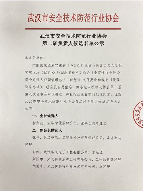 武漢市安全技術防范行業協會第二屆負責人候選名單公示