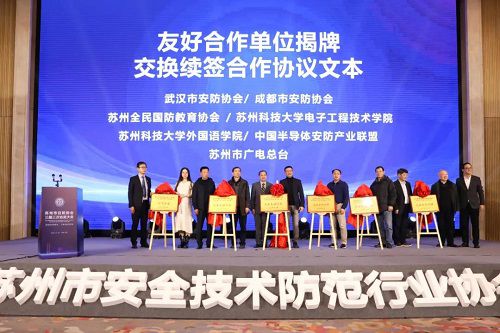 會(huì)上,蘇州市安防協(xié)會(huì)與武漢市安全技術(shù)防范行業(yè)協(xié)會(huì)、成都市安防協(xié)會(huì)、蘇州全民國(guó)防教育協(xié)會(huì)等六個(gè)單位建立了友好合作關(guān)系,蘇州市安防協(xié)會(huì)領(lǐng)導(dǎo)與友好合作單位領(lǐng)導(dǎo)共同揭牌。