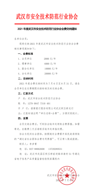 2021年度武漢市安全技術防范行業協會會費交納通知