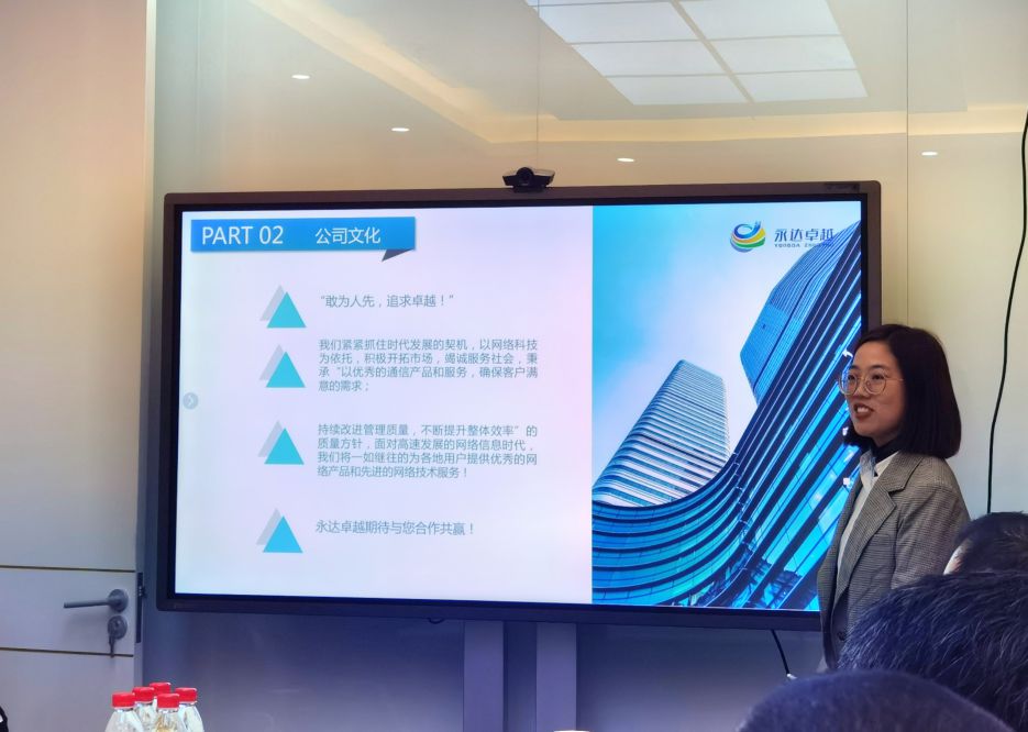 永達卓越商務部經理王亞芳向大家介紹了公司情況,湖北永達卓越網絡科技有限公司是一家專業從事政務、教育、部隊、醫療、企業、金融、酒店等政務機關、企事業單位及民用設施弱電系統集成、網絡產品銷售、網絡運營服務、弱電智能化項目工程、方案規劃設計及咨詢的綜合信息服務企業。公司與國內眾多IT廠商有著良好的合作伙伴關系,并不斷引進新產品、新技術,將最新的產品和技術帶給用戶。目前公司為“大唐電信”綜合布線產品湖北省金牌代理商,H3C網絡產品銀牌代理商,華三綜合布線產品湖北省獨家代理商,紫光華智認證代理商,安恒安全產品代理、追日電器新能源汽車智能充電代理商。