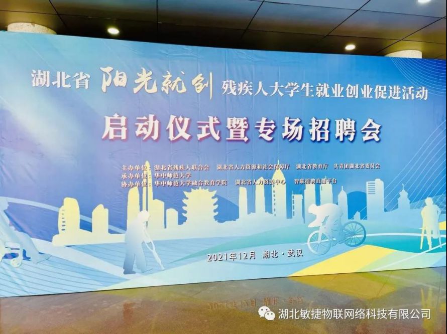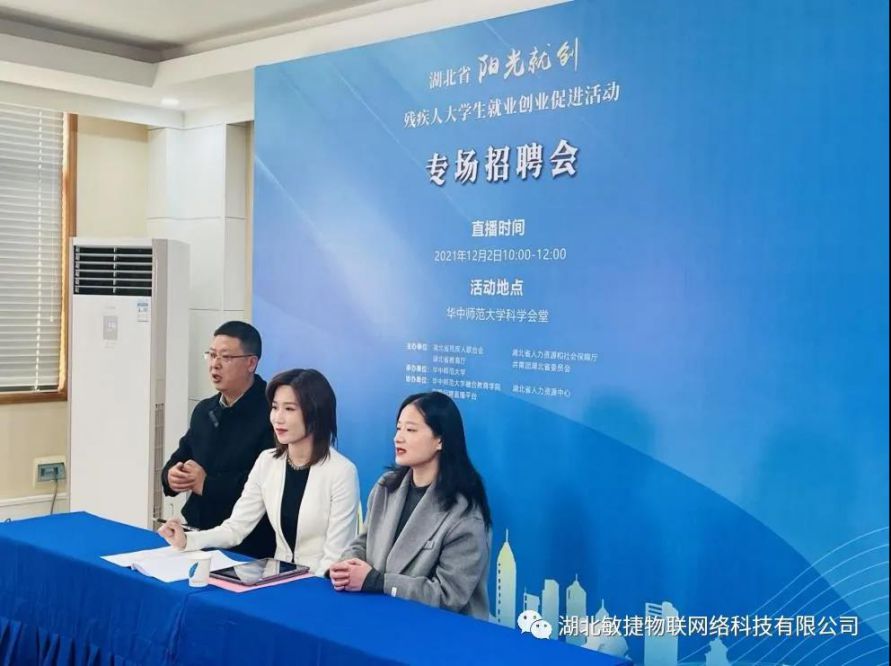 2021年12月2日,理事單位湖北敏捷物聯網絡科技有限公司受邀參與由湖北省殘疾人聯合會、湖北省人力資源和社會保障廳、湖北省教育廳、共青團湖北省委員會主辦,華中師范大學承辦,華中師范大學融合教育學院、湖北省人力資源中心、智聯招聘直播平臺協助舉辦的“陽光就創”殘疾人大學生就業創業促進活動。