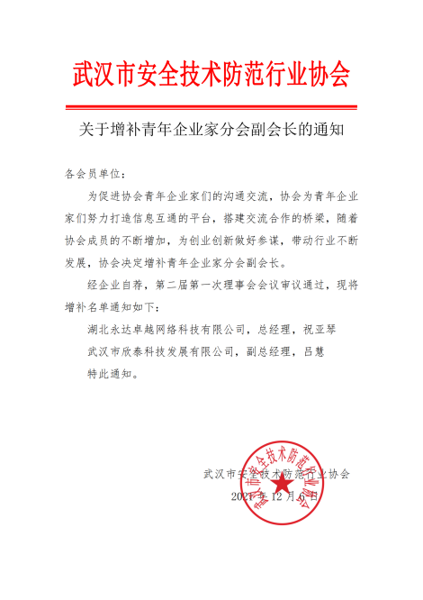 隨著協(xié)會成員的不斷增加,為進(jìn)一步擴(kuò)大理事的代表性和工作覆蓋面,為會員提供及時有效的服務(wù),根據(jù)《武漢市安全技術(shù)防范行業(yè)協(xié)會章程》和市民政局建議,應(yīng)廣大會員單位的要求,協(xié)會決定增補(bǔ)理事單位。經(jīng)企業(yè)自薦,第二屆第一次理事會會議審議通過,現(xiàn)將增補(bǔ)名單通知如下: